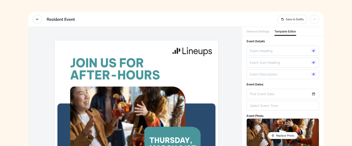 Experience a new way to design with Lineups Design Assistant. Forget spending hours navigating complex interfaces or searching for logos, color codes, or the latest photography. Lineups Design Assistant makes it easy, delivering professional-quality results every time.